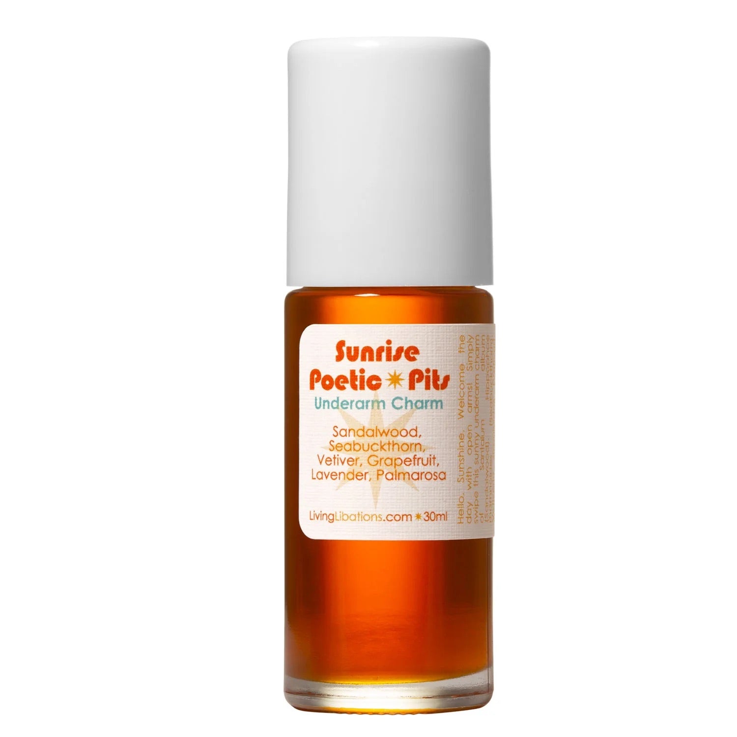 Living Libations Sunrise Poetic Pits is made from 100% natural and organic essential oils of seabuckthorn, lavender, vetiver, grapefruit, lemon-scented palmarosa all blended with sensual sandalwood. A beautiful deodorant made with all the beloved fragrances used the in the Best Skin Ever Seabuckthorn. With a roll of this shining elixir, your underarms will be blessed with sun-ripened citrus.