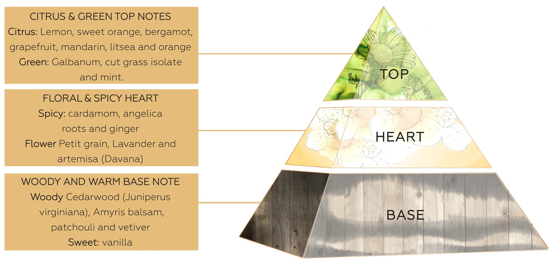 Its impact on the mood is conferred by a timeless 100% natural aromachological blend, composed of more than 20 essential oils, designed to express life with infinite delicacy. Its fine citrus notes of lemon, grapefruit, mandarin and orange wrapped in the intense scents of cedarwood, amyris, patchouli and vetiver, is enhanced with the sweetness of vanilla and powdered in a world of fantasy encompassing the scents of cardamom, angelica and ginger spices, petitgrain flowers, lavender and artemisia and the greenery of galbanum and mint. These aromas blend beautifully, creating a world in which the extraordinary is revealed in broad daylight.