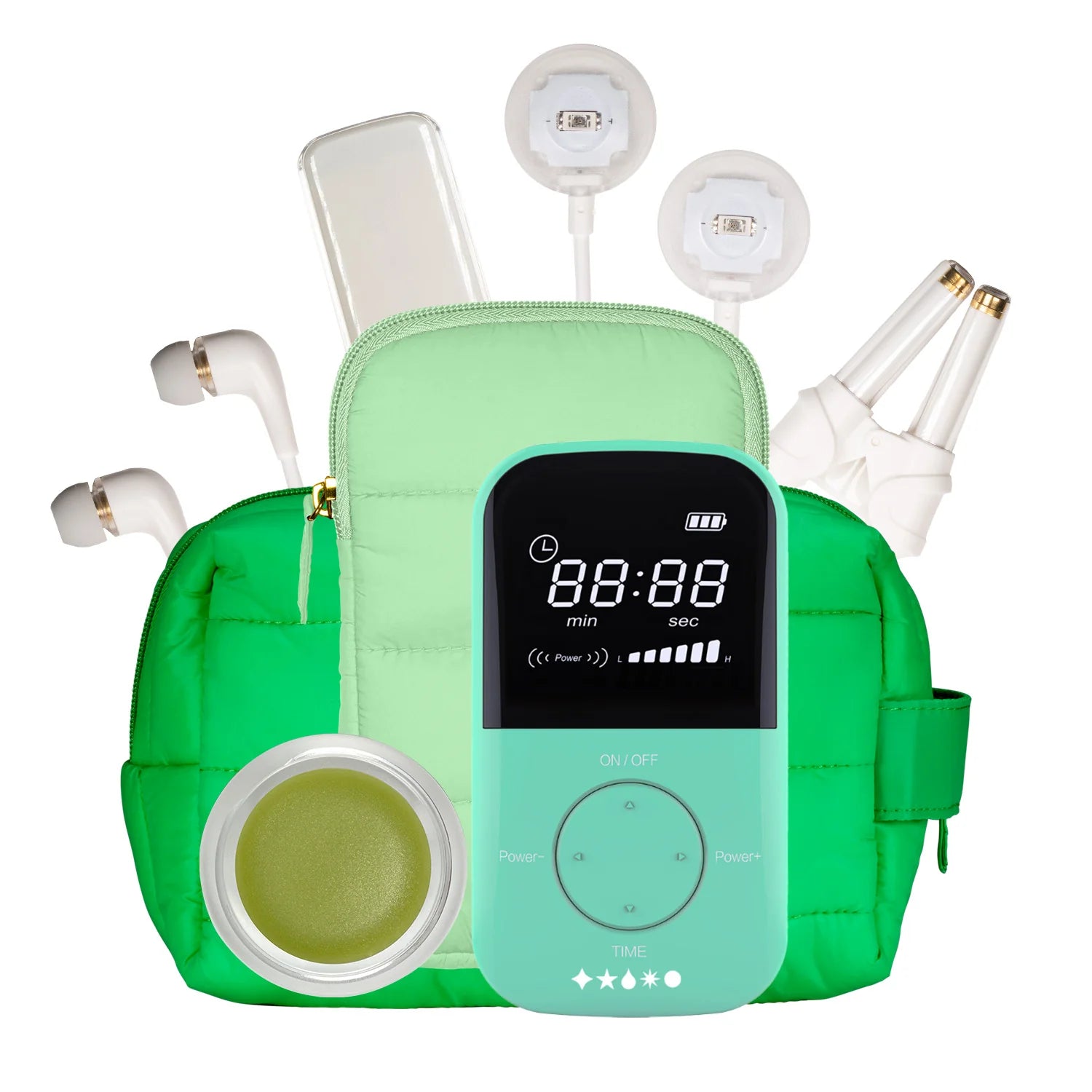 Four actions are contained in one effective, easy-to-use portable device. This compact biohacking tool is easy to hold and take on the road at just 4¾ inches (12.1cm) long, 2½ inches (6.8cm) wide, and half an inch (1.5cm) thick. The 5mW long-lived lithium battery is recharged with a USB charger. You can control the session length and intensity with a built-in adjustable timer that turns off in 10–60-minute intervals.
