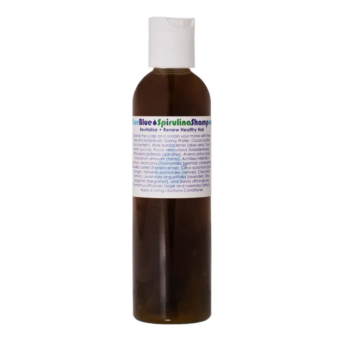 Wave good-bye to waxy buildup and so long to split ends. Dismiss dry flakes. Tame unruly tresses. Say hello to healthy hair. Love your locks. Ordain your mane. Consecrate your curls. Living Libations Blue Spirulina Shampoo is a pure powerhouse that protects your magnificent mane with a force field of nature's most fortifying compounds formulated to bathe hair in brilliance and bring bountiful bounce back to your locks.