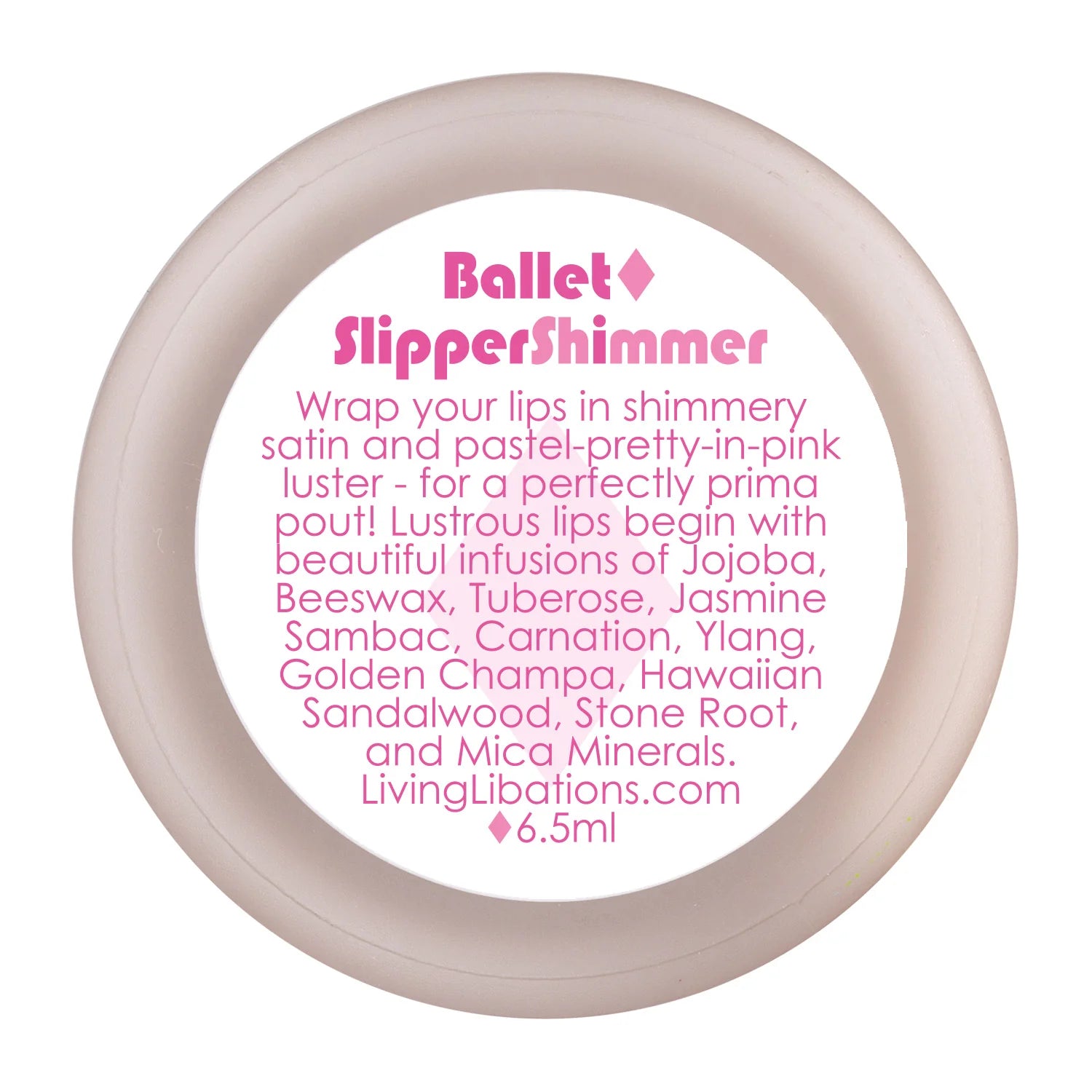Living Libations Ballet Slipper Shimmer adorns luscious lips with the moisturizing, shimmering essences of satin and a subtle sparkle of a prima ballerina’s pink pointe shoes.