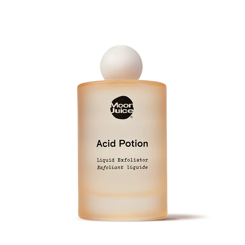 Moon Juice Acid Potion contains Glycolic, Lactic, and Salicylic Acid to help unclog pores and resurface for smoother skin. Niacinamide and adaptogenic Reishi help hydrate, soothe, and balance.Packaged in glass with a recyclable cap. Please separate cap from bottle and recycle both. FSC certified outer carton, please recycle.