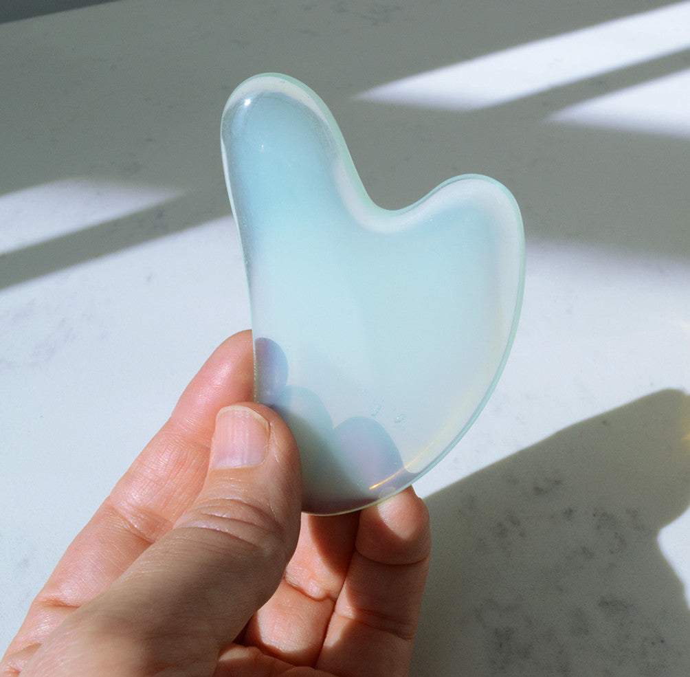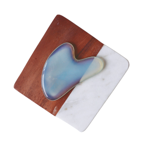 The Opalite Gua Sha tools are handmade by fair paid artisans in India. They have a delicately hazy, light blue color to them. Facial Gua Sha comes from an ancient Traditional Chinese Medicine technique to stimulate circulation and energy within the skin and tissues of the body. Results from a Gua Sha session include a firmer appearance and healthy glow to skin. Long term practice of this technique can help skin resist sagging.