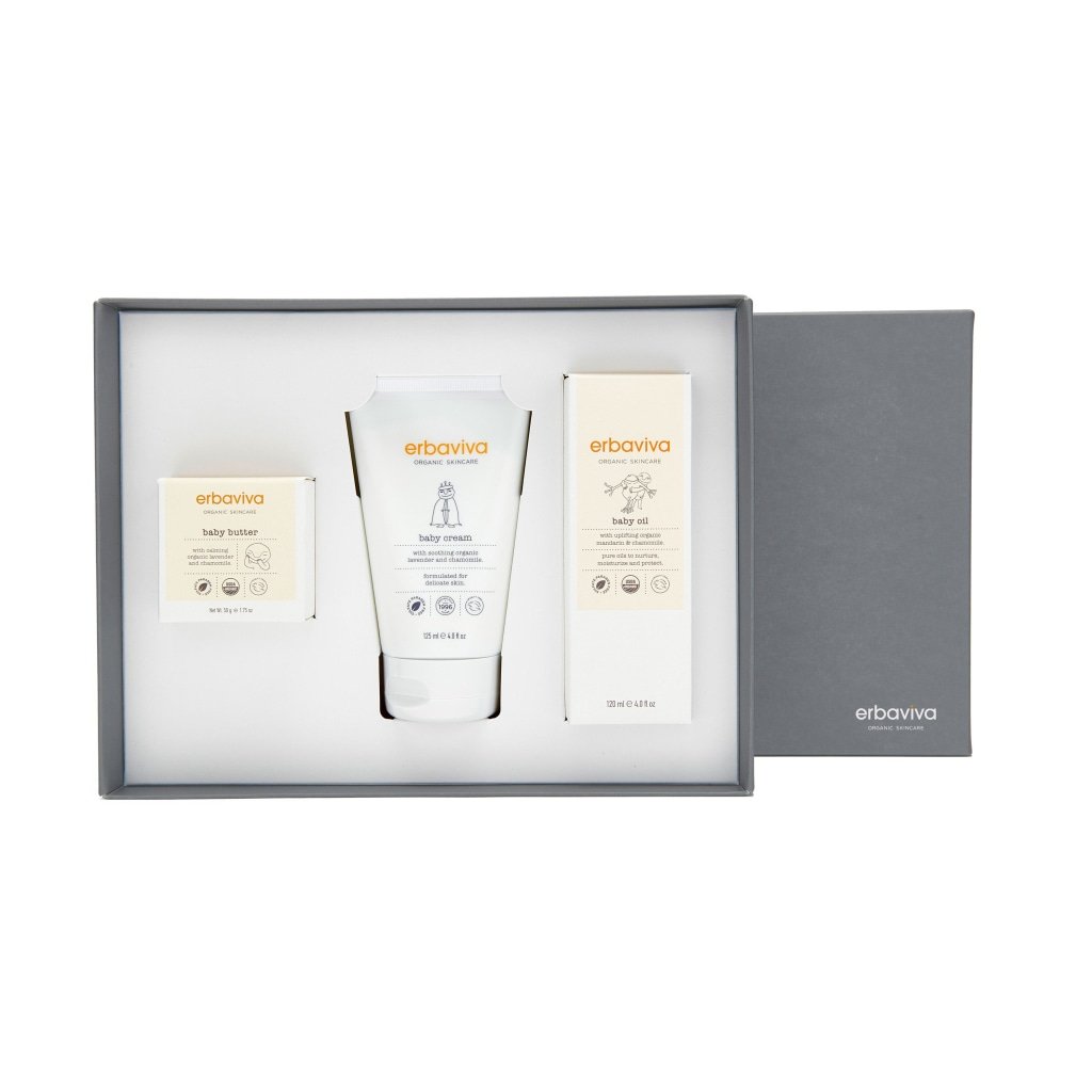 This trio of purely organic baby products makes an ideal gift for your little one. The set includes Erbaviva's top-selling Organic Baby Butter, Baby Cream, and Baby Oil - all specially crafted to deliver the nourishment, hydration, and protection your baby's skin needs. Infused with calming and aromatic organic essential oils, they're perfect for after-bath pampering or any time your baby needs extra care. This baby skincare collection also makes a fantastic baby shower gift!