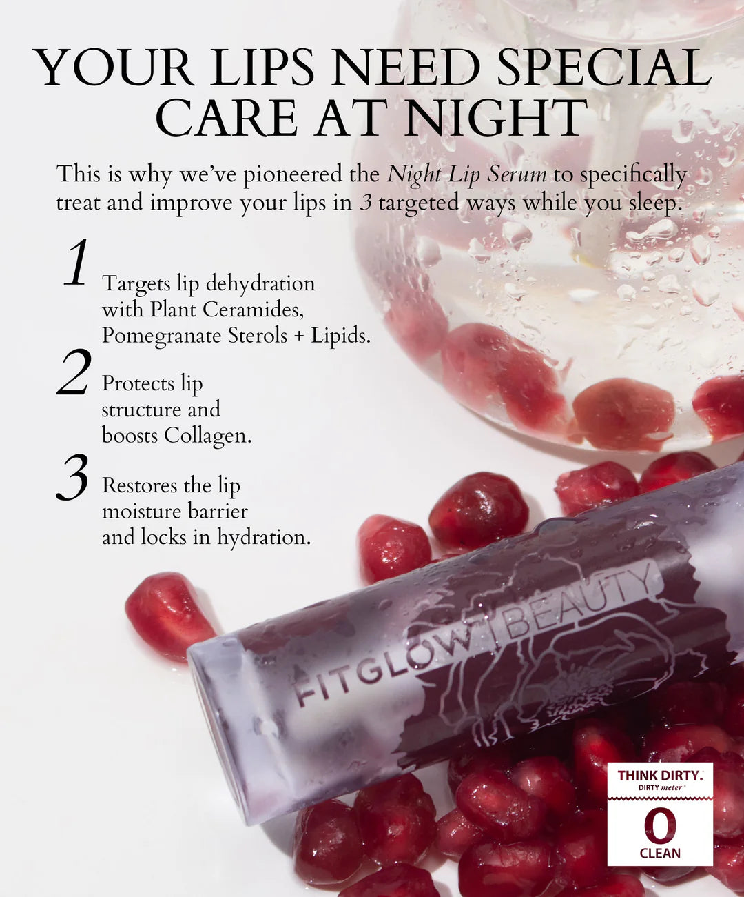 Softens, hydrates and transforms lips at night with proven plant extracts and vitamins. Fitglow's unique Plant Ceramides formula restores lip moisture barrier while protecting from water loss. Organic pomegranate Plant Sterols, Beet Extract, and Vegan Collagen improve lip cell structure, increase lip volume and fight signs of aging.