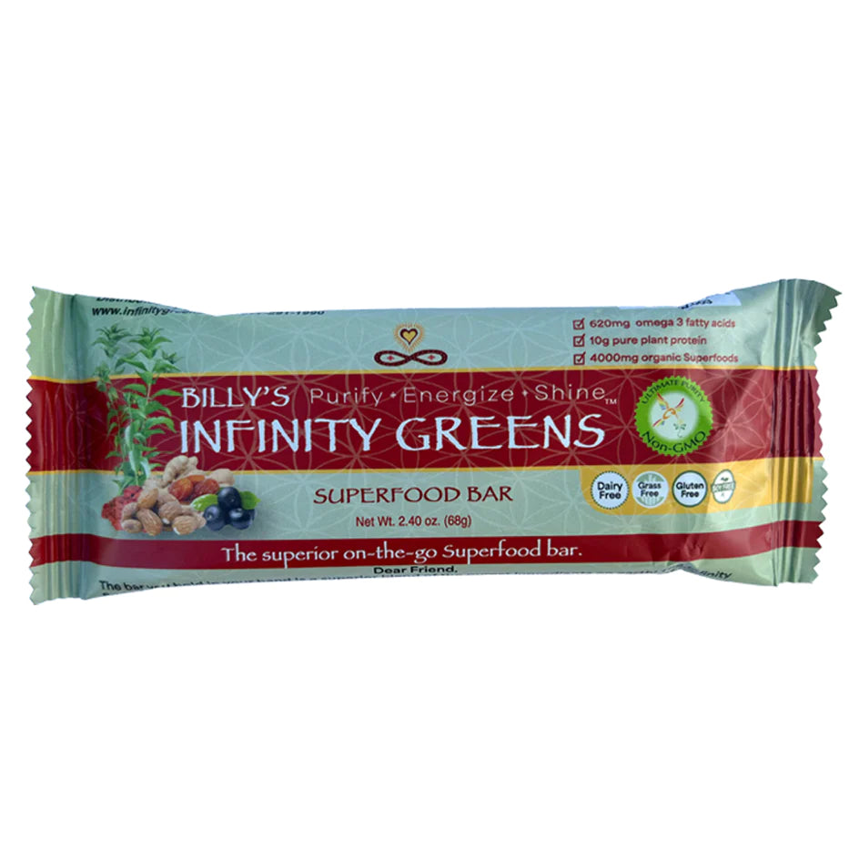 The Infinity Green bar, a superior MEAL REPLACEMENT, is unmatched when it comes to health benefits from an energy bar. You'll be nourishing your body with essential vitamins, minerals, antioxidants, and enzymes. Additionally, the Infinity Greens bars contain 680mg of Omega-3 essential fatty acids.