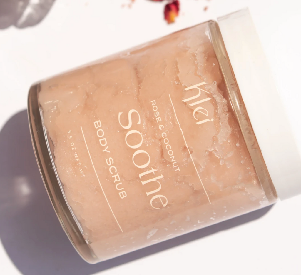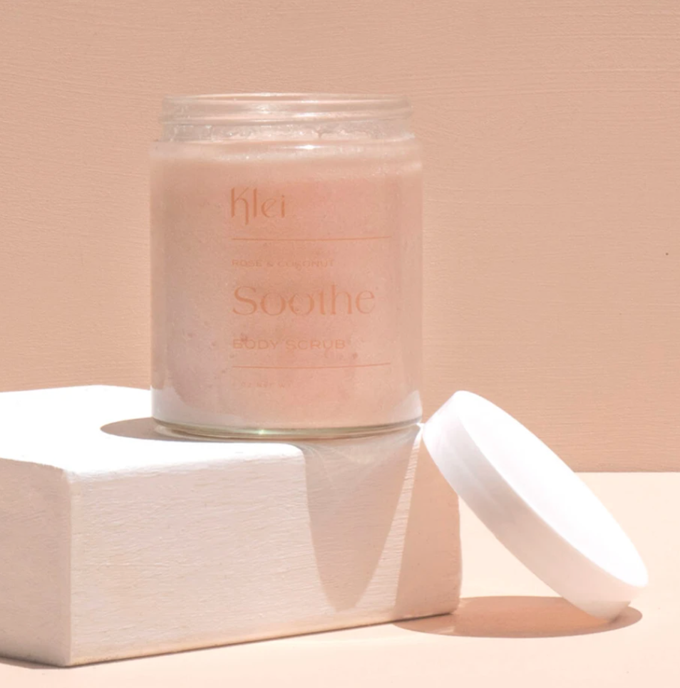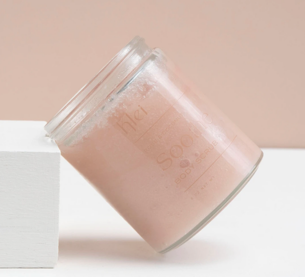 SOFTEN & SOOTHE Get radiant & glowing skin with KLEI's decadent Soothe Rose & Coconut Body Scrub. Softening shea butter and moisturizing safflower oil are blended with sugar to gently exfoliate, leaving the skin feeling soft and smooth. Find stillness with the soothing scent of coconut and rose petals.