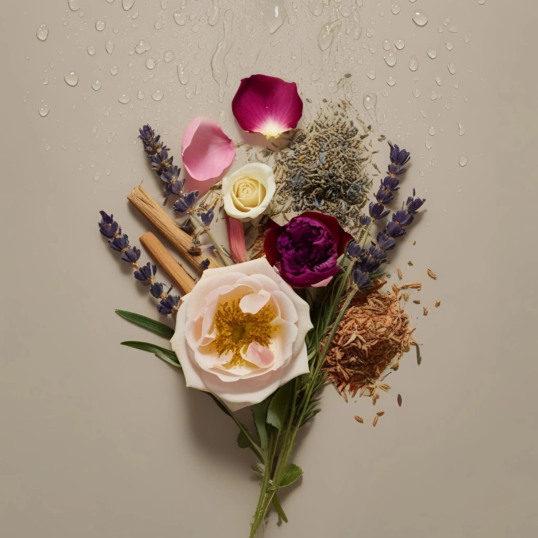 Rose Hydrosol (Rosa damascena), Rose Otto (Rosa damascena), Immortelle (Helichrysum italicum), Lavender (Lavandula angustifolia), Sandalwood (Santalum album).