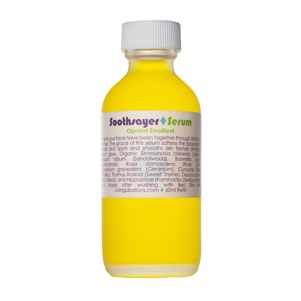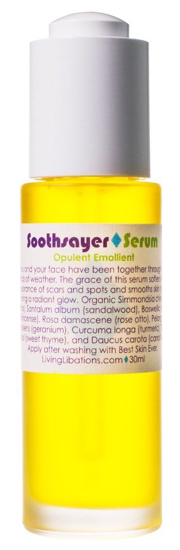 Living Libations Soothsayer Serum is a nourishing blend of botanical oils formulated for maturing skin. Star ingredient Sandalwood reinforces the skin's natural defense and helps reduce harmful environmental effects. It helps reduce scarring, age and acne spots, and provides a smoother skin texture for an airbrushed complexion.