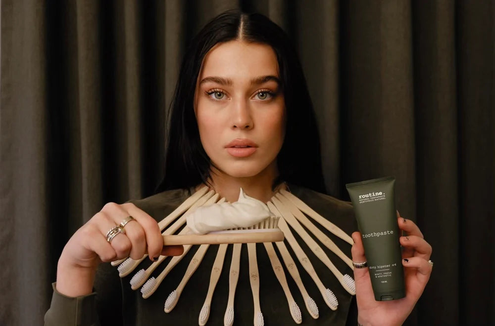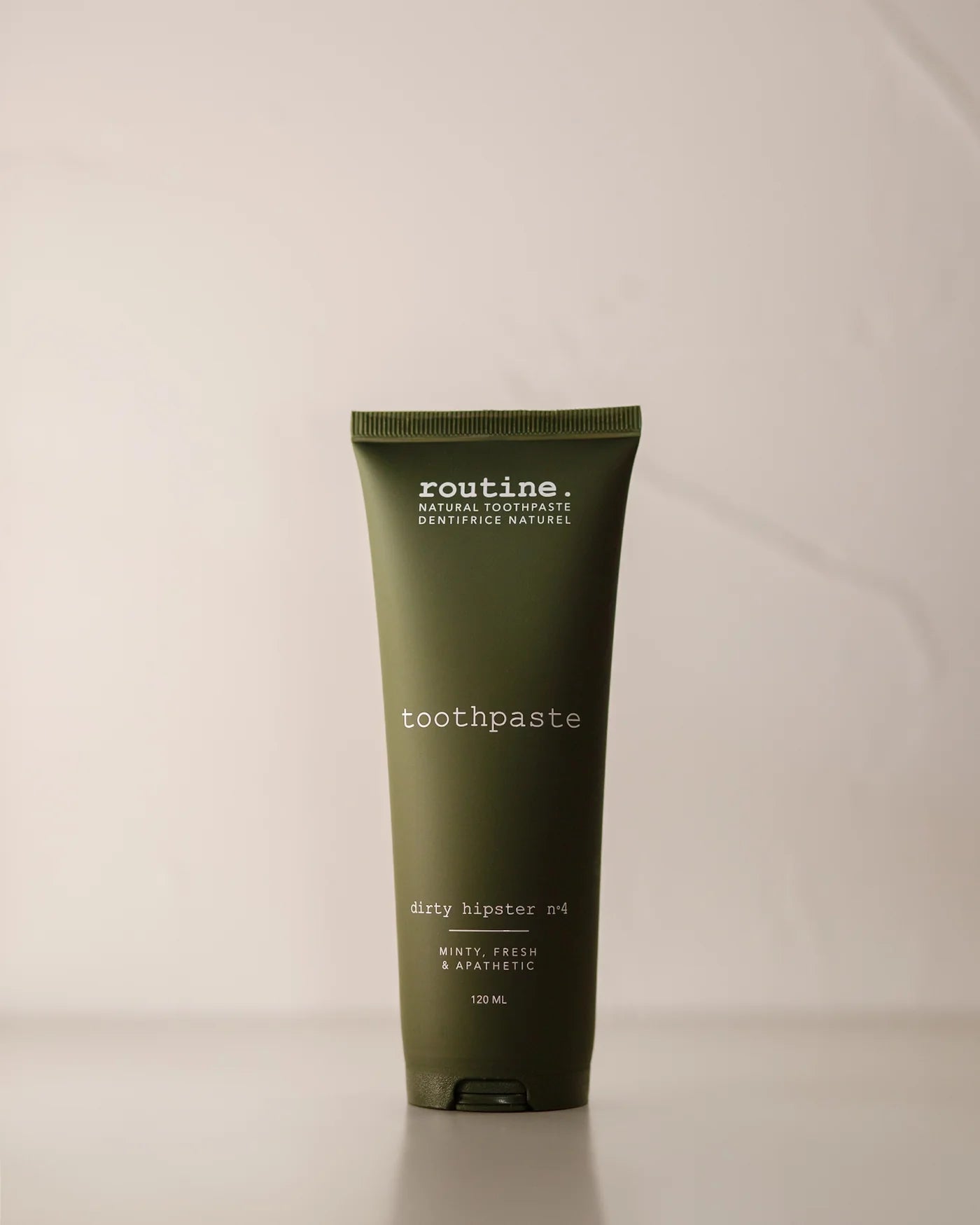 KISS MORE, SAY LESS. FRESH MINT for your dirty mouth. Make your mouth so fresh and so clean with Routine toothpaste cream. Featuring moonlight charged essential oils and mineral rich hydroxyapatite, to polish those ivories and give your cakehole good mouth feels and youthful longevity. Kiss kiss, bang bang and don't forget to scrape your tongue silly goose.